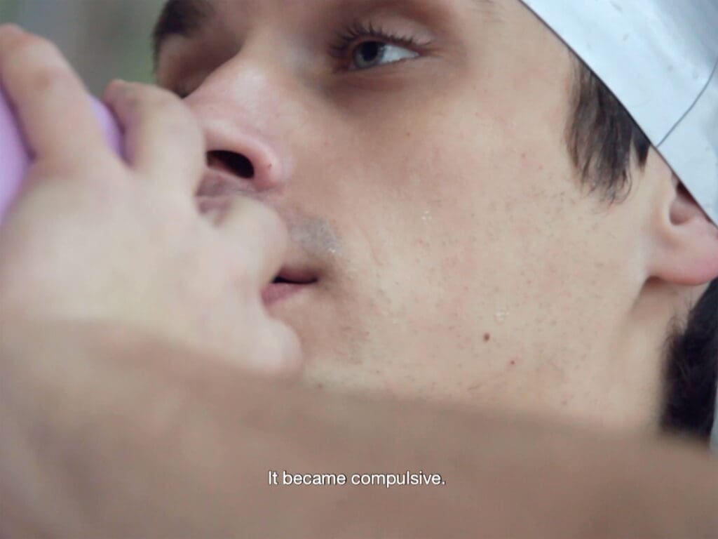 Sport is a spectacle that fulfils the social function theatre once served in antiquity—gathering a city or nation within a shared experience. Narratives of heroism and sacrifice construct a founding myth of the state: a glorious origin story that often conceals underlying trauma. The film Blood Sweat Tears (2019) focuses on this trauma—emotional, physical, and historical—affecting both individual and collective bodies, and on the modern therapeutic practices (self-help groups, massage, exercise) used to address it. The work centres on what is expelled or exorcised from the body and mind, portraying the main character as someone who releases both emotional (confessional and biographical) and physical (sweat and saliva) discharge.
