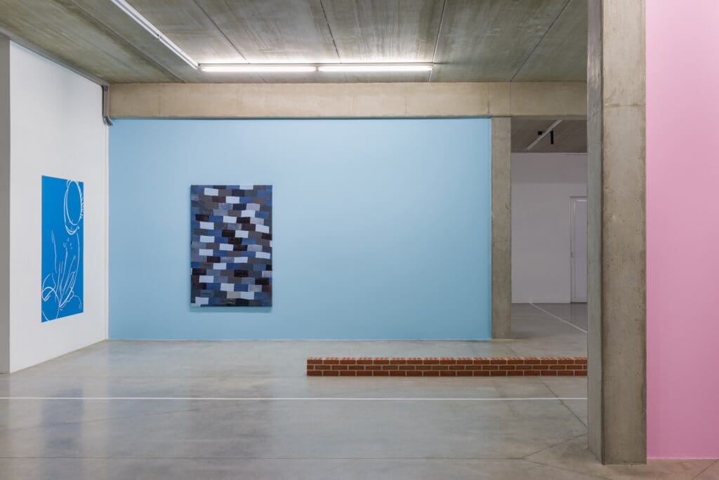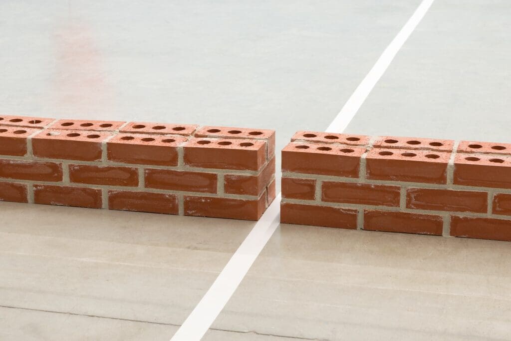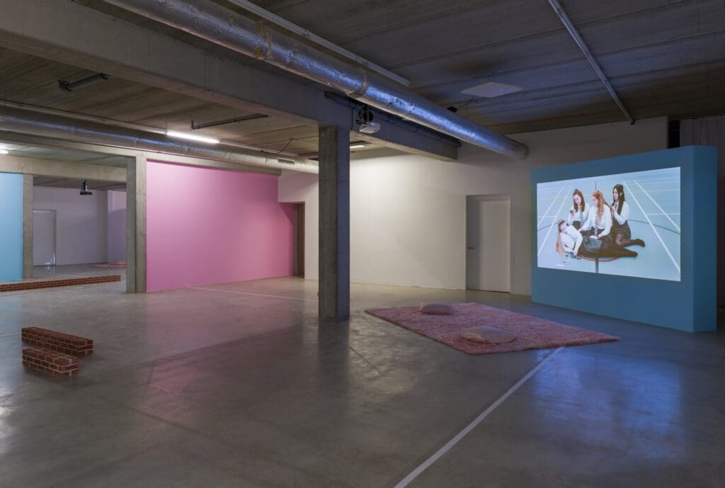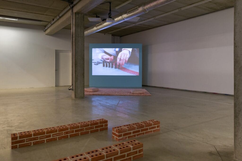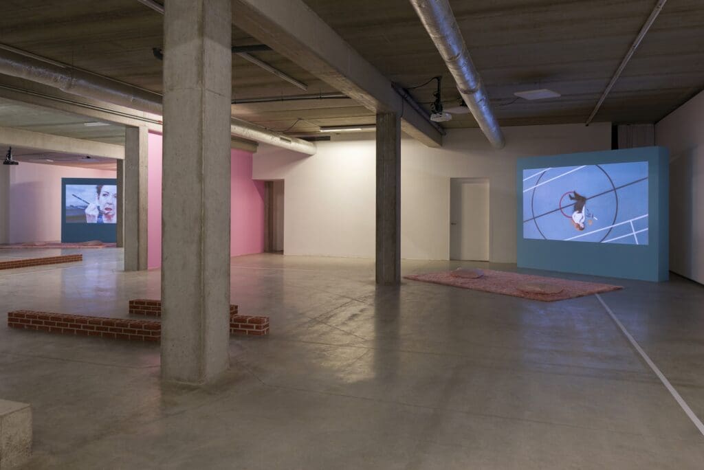 The first work encountered by viewers when entering Helen Anna Flanagan’s solo exhibition “Gesticulating… Wildly”, is the film Gestures of Collapse (2019), set inside a generic school gymnasium and narrated by a dandy television presenter. Four uniformed schoolgirls carefully traverse the gym, along and across the colourful lines marking the floor. These lines are both familiar and cryptic, denoting rules only half understood, that can change from one hour, one game to the next. They don’t physically prevent or allow movement but hold the power to determine who wins and who loses. The exhibition itself is also structured by these demarcations, with lines of tape and low brick walls dividing and connecting different areas.