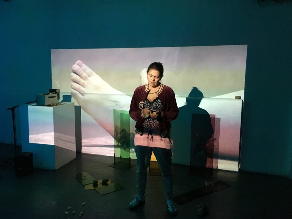 Mash-up involves an actress in the setting of a video installation. She rhythmically makes her way through a monologue premised on the style of street rap-battles, a type of rapping that often includes brash bragging and comical insults. The figure battles with herself and an anonymous audience. The potato is used as a repetitive motif within the installation. Clusters of potatoes are screen-printed on stained glass panels and the vegetable is used as a prop to be peeled, quartered and diced. Throughout the performance the potatoes are cooked in a deep-fat fryer with the violent sound amplified through a speaker. The potatoes are cooked in fat for the duration of the performance and later served to the audience.