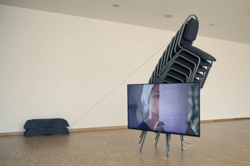 The video 'Split or a Yawning' takes the form of a rehearsal. The script was premised on the transcripts of an incident in the reality television gameshow Celebrity Big Brother in which the news of the death of the musician David Bowie caused hysteria and confusion among the participants due to the fact that one of them was similarly called David. The transcript was appropriated and further formalised through repetitive language, imitative gestures and sourced props.